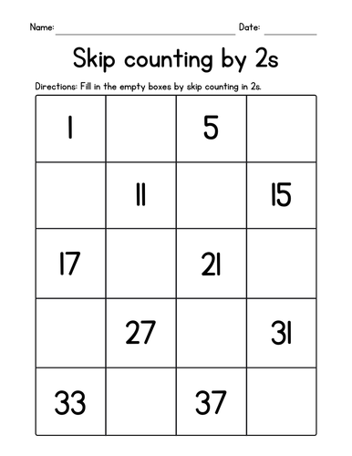 Counting by 2s | Worksheet | Education.com Worksheet Counting by 2s Can your child count by 2s? "Skip counting" is an important early math skill that underpins multiplication later on. Help your child practice with this basic worksheet, which challenges her to count the dots and write the numbers — by 2s! Download Free Worksheet Add to collection Assign digitally Grade Kindergarten